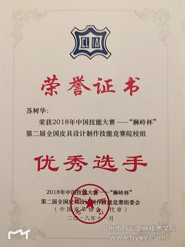 日前,由中国皮革协会、中国就业培训指导中心、中国轻工业职业技能鉴定指导中心、中国财贸轻纺烟草工会共同主办的2018中国技能大赛—“狮岭杯”全国皮具设计制作技能竞赛在广州市花都区狮岭镇圆满落下帷幕。广州市白云工商技师学院服装系2018级皮具设计中技班苏树华同学,在与来自全国29所本科和高职院校26名选手的同台角逐中,凭借其作品的创新性和实用性,深受大赛评委专家的一致好评,最终获得院校组“优秀选手”荣誉称号。